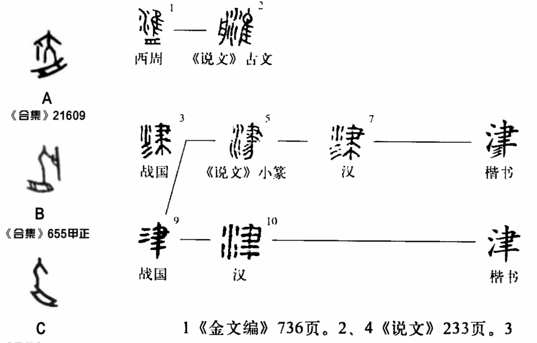 周代金文的“津”字作图1,上部是“淮”字,下部是“舟”。淮河是中国古代四大水系之一,支流甚多,驾船过河的景象比其他水道更为突出,故津字又改为从舟从淮会意。也有人将“水”和“隹”分开理解,会乘舟渡水如鸟之飞跃意。《说文解字》古文由此发展而来,只不过把“舟”字移到了“淮”左边。篆文作图5,《说文解字》解为:“从水,𦘔(jīn)声。”《说文》篆文字形从水,表示与水相关;“𦘔”其实是战国文字(图3)“水”下部的“彡”移至“聿”下得到的。还有一支战国文字省“𦘔”为“聿”,沿袭至今。有学者认为此字当从水,聿(yù)声。