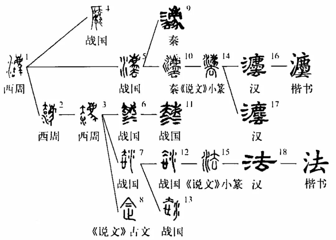 《玉篇》:古文法字。注详五画。《说文》:刑也。平之如水,故从水。廌所以触不直者去之,故从廌从去。《周礼·天官·太宰》以八灋治官府。