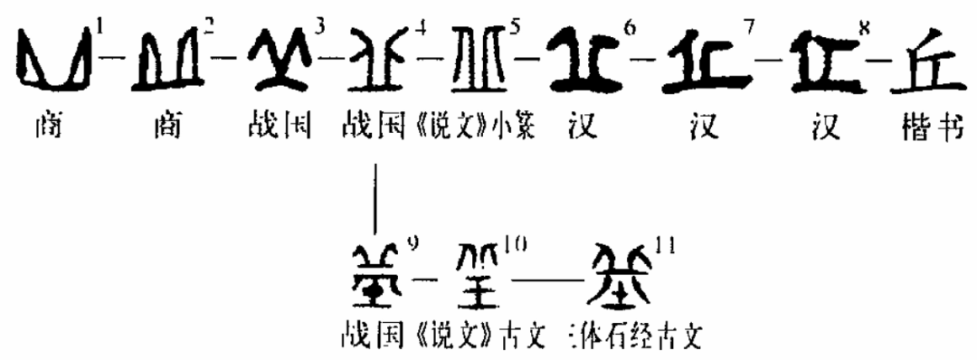 象形字。甲骨文(图1、2)的“丘”看上去像并峙的山峰,即“两丘突兀之形”,其本义就是指“小土山”或“小土堆”。不过,在古文中,“丘”偶尔也指以大山,如昆仑山古称“昆仑丘”。到了金文(图3、4)阶段,原像小土山的部分讹成“北”形,这一字形被小篆(图5)所沿袭,致使许慎释为会意字,不过他的其他解释与古文字形相符。战国文字或在下部追加土旁以增显其义(图9)。汉代隶变,所从“北”形的笔画在平直过程中又被无理据地加以连接,“北”貌全失(图6-8)。