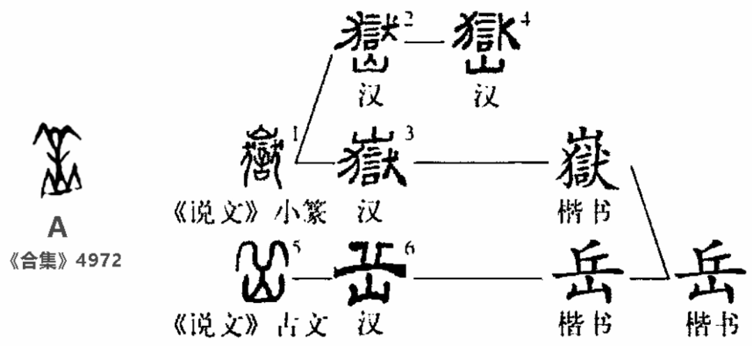 “岳”,会意字,古文写作“嶽”。《说文解字》无“岳”字,有“嶽”字。对于“嶽”字,许慎先指出“五岳”的名称,然后分析字形。“从山狱声”,说明“嶽”字为形声字。有人认为,“嶽”字的声符“狱”也有表意作用。古代牢狱的围墙又高又厚,以免犯人越狱逃跑。秦汉之际,狱字已有牢狱义。住在大山区的人,周围都是高山环绕,像在牢狱中一样。以字用狱作声符,取其周围高大像狱之意。“嶽”字产生以后,成了古籍中的常用字,比岳字出现的频率高得多。许慎并没有明确这些山成为岳的原因,不过列举了一个很重要的重文,即图5。这一重文由两部分构成,下为山,上为两座相连的山脉,较为形象地描写了“岳”的特点,可谓山外有山。其实,《说文解字》中的这一重文与甲骨文“岳”一脉相承。