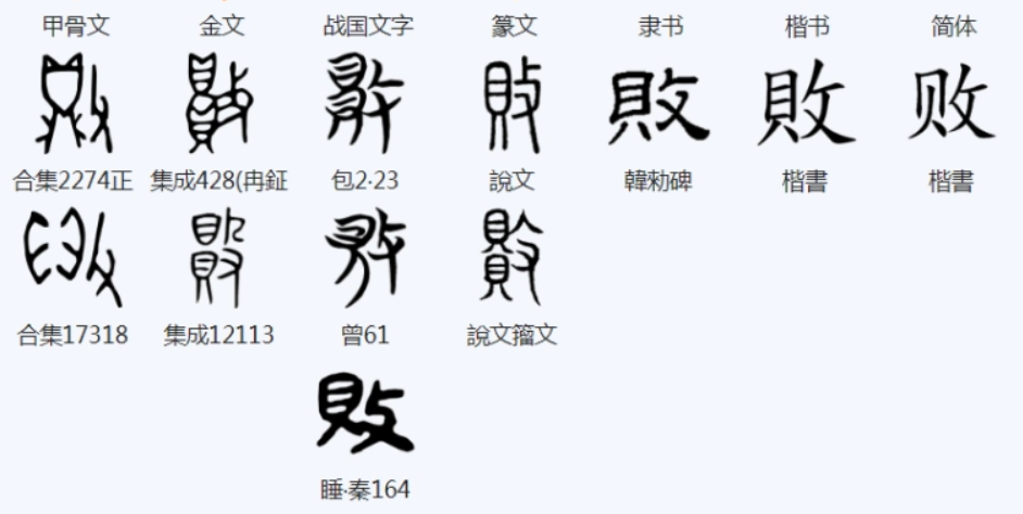 败(bài) ,“敗”的简体,会意。表示毁鼎破尊。有的甲骨文以“贝”(钱财)代“鼎”,表示毁坏家财。造字本义:敲破尊鼎,损毁家当。金文用两个“贝”强调毁坏大量钱财。篆文基本承续金文字形,只是省掉了一个“贝”。