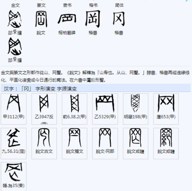 6、注意:由于冈作了偏旁,其义后便加义符“山”写作了“岗”来表示。如今简化仍作“冈”。