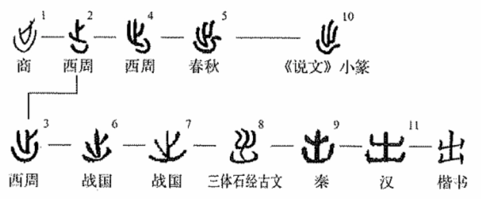 “出”的本义为从坑底下走向高处。词义扩大,又指从内里走到外面。秦代文字有两种写法:小篆作图10,隶书作图9,楷书的“出”字即由后者演变而成。本义是从里面到外面(跟“入”相对)。可引申为离开。如:《玉篇·出部》:“出,去也。”又可引申指发出。如:《商君书·更法》:“于是遂出垦草令。”《史记·屈原贾生列传》:“入则与王图议国事,以出号令。”又指拿出,交纳。如:汉曹操《抑兼并令》:“户出绢二匹、绵二斤而已。”又指支出。如:汉桓宽《盐铁论·贫富》:“量入为出,节俭以居之。”又引申指出产,生产。如:《荀子·富国》:“田肥以易则出实百倍。”(以:而。易:治理,这里指管理得好)汉桓宽《盐铁论·本议》:“故工不出则农用乏。”又指产生,发生。如:《荀子·对学》:“肉腐出虫,鱼枯生蠹。”又引申指出现,显露。如:《乐府诗集·相和歌辞三·陌上桑》:“日出东南隅,照我秦氏楼。”宋苏轼《后赤壁赋》:“山高月小,水落石出。”又引申指超出,超过。如:《孟子·公孙丑上》:“出乎其类,拔乎其萃。