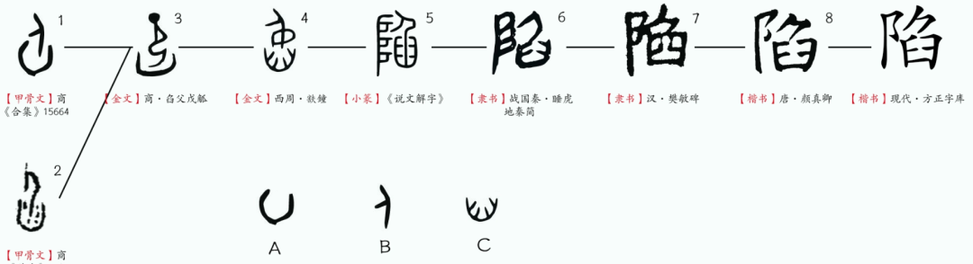 “陷”,原本是一个会意字。甲骨文以人落“坎”中表示坠入、掉入之义。金文的“陷”字在中间增加一个圈,表示陷阱之口。在汉字演变过程中,小篆字形左边又增添了一个“阜”。“阜”的本义为梯子,在此表示陷阱很深,仍表示一个人坠入穴坑之中。所以“陷”字的本义为掉入他人挖掘的陷阱。楷书一脉相承,经由隶变后写作“陷”。