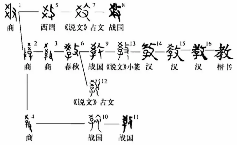 “教”,会意兼形声字。甲骨文的“教”字从爻从子从攴”:“爻”字取象于栅栏的交错,因而有禁行的意思;“子”乃儿童的象形描述;“攴”则为手持鞭杖之义。三形会意,表示成年人手持鞭杖,训导孩子不可越规。金文的“教”字与甲骨文同构,上边的“爻”字相互交错。小篆秉承金文;楷书在隶化过程中,将“爻”字稍稍变异,写作“教”。