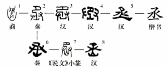 “丞”chéng,会意字。甲骨文字形象个人陷入坑中,上面有一双手进行救助,正在把“人”从坑中拉上来的样子。金文的字形,省去了表示陷坑的外框,因为有甲骨文在先,所以一看便明白这是从陷坑中救助的意思。小篆的“丞”字,因人形弯来绕去而难以辨识,但左右两边伸出的双手,以及下边的坎形“∪”,仍明晰可辨。楷书隶变后写作“丞”。