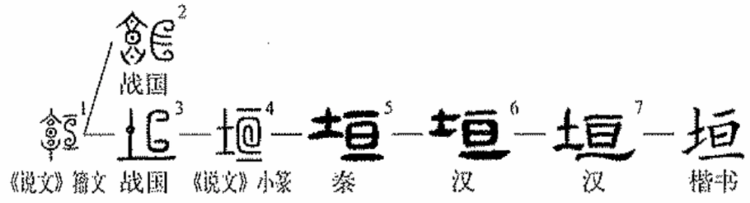 “垣”yuán,会意字。“垣”=(土,墙)+(像围绕之形),造字本义:表示围墙绵延不绝。图1是《说文解字》籀文,左部是古文字“