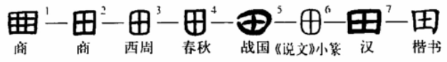 “田”,象形字。甲骨文和小篆的字形,均像阡陌交错的土地形状,只是中间横坚的笔画有多有少:方框内纵横交错,就像大地被垄埂分割成的一块块的农田。周代曾推行“井田制”,将田地划作并字形,八家为一井,各家种植边上的块田,收获归已;中间则为“公田”,与甲骨文中的“田”字十分相似。如《诗经》中的“雨我公田,遂及我私”。现今,从高空鸟瞰农田,其形状也与“田”字的古文字字形相近。