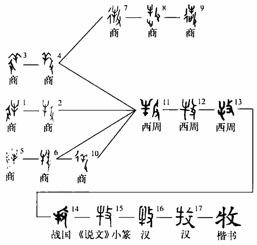 “牧”在甲骨文里有多种写法,构件的位置或左或右,并不稳定。西周时大量异体被淘汰,仅保留了从攴从牛的字形,且牛左攴右的布局亦得固定。战国至《说文解字》沿袭了西周结构。但隶书把手形和牧鞭形合为“攵(反文旁)”,为楷书所继承。