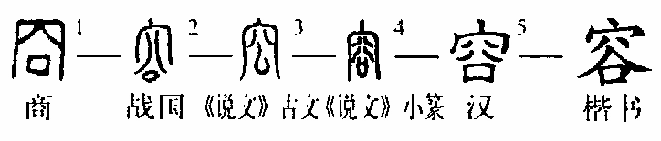 “容”,会意字,甲骨文“容”字的物象本源,也来自上古社会的地穴建筑,即口小肚大可容物的地窖。远在新石器时期,人们已营建这种地穴式的建筑,用于储粮食和物品,豢养家畜、关押俘虏。甲骨文的“容”字,正是对这一生活原型的真实写照。金文的“容”字与甲骨文相比,形似但构形主旨大为变样,已失去明确的会意指向,小篆缘此将甲骨文的“容”讹变为“盛谷之屋”。这是在金文字形上添加个“宀”,将错就错而形成的。楷书由小篆演变而来,写作“容”。