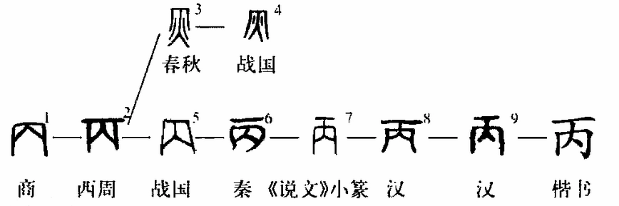 “丙”,象形字。甲骨文的“丙”字与洞穴的“穴”字同源,均取象于地穴的横剖面。六叔认为:“丙”字源于上古社会的地穴式房屋,室小,无屋顶,比“穴”字使用更早,本义为人工挖掘的用于居住的狭小地洞,因造字较早且原义使用甚少,后被假借到“天干”产生其他义,后造“穴”做为地穴的统称。金文的“丙”字与甲骨文相似,只是多了一款内部全部填实的“八”型,其空处恰似“地穴”的空间;小篆在向“方块文字”的演化过程中,上边增加一横,里边交叉斜线也出了头,形式上更为匀整美观(也为了与“穴”字相区别);楷书缘此写作“丙”。
