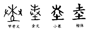 “坴”lù,会意字。甲骨文的“坴”字,上部是一个“木”,乃树木的象形描摹,旁边则是两只手形,下部是一个土块之形。这里,三形会意,表示将树苗连同根部的泥土挖掘起来,进行移栽。金文和小篆字体一脉相承,下部的土块形演变为“土”字,上部的树木之状发生变异,使神韵全失。楷书经由隶变后写作“坴”。