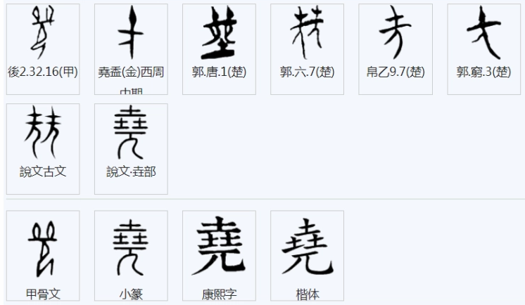 “尧”做为构字偏旁,活跃在诸多汉字之中,如“浇”,便表示水自头倒下。“嶕峣”一词,表示大火将山上林木娆尽,因而《广韵》一书释为“山危”,乃是由光秃而无法攀援引申出了高峻义。“晓”则表示日将未出时,太阳仍在云层的包围之中。“饶”,以人被四周众多的食物所包围,来表示多而丰富;“烧”则以四周之火来表示燃烧,发烧。