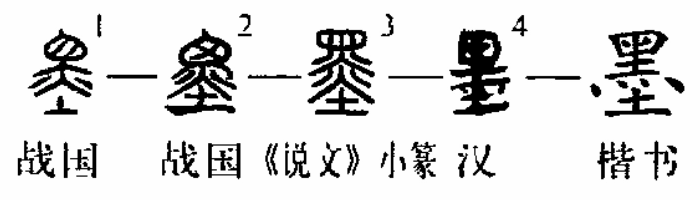 “墨”,会意字,楚帛书上的“墨字,与小篆字体相同:上部是-个“黑”,下部是个“土”:“黑”的构形下部是“炎”,上部则是浓烟一团的象形描绘,本义为浓烟,引申后又指黑色:这里“黑、土”会意,表示写字绘画用的黑色颜料。实际上,古代的“书墨”,早期多使用石墨,秦汉时期,则以燃烧松枝而生成的烟垢制作,“墨”字的构形正反映了这种物品的生成来源。