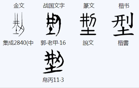 “型”,会意字。金文的“型”字,右边和上部是一个“刑”,左下角是一个“土。“刑”在古文中是一个由人体背部的血痕(#)和荆条刑鞭组成的会意字,本义为施刑。这里“刑、土”会意,表示以土压制拍打使之成为青铜器或铁器的范模。小篆的“型”字演变为比软整齐的上下结构,但荆条刑鞭上的小叉去掉后,演变为一个“刀”字。楷书经由隶变后,写作“型”。