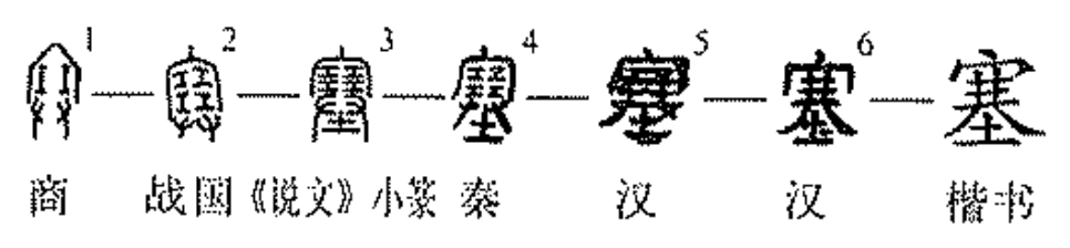 “塞”sāi,会意字。小篆的“塞”字下边有一个土,上边是一个复杂的会意字:其最上为“穴”的简省“宀”,内里是四个穿通符号“I”的排列,下边是左右各一的两只手(又)。整体字形用双手不断地向洞穴中填土,来表示堵塞、填塞之义。经由隶变后,楷书写作了“塞”。