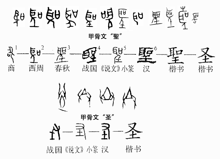 金文中的“圣”字(图3)将“人”变为“壬”(表示挺立),以强调耸耳而听。篆文中的“圣”字(图5)整齐化,讹变为从耳,呈声,隶变后楷书写作“圣”。