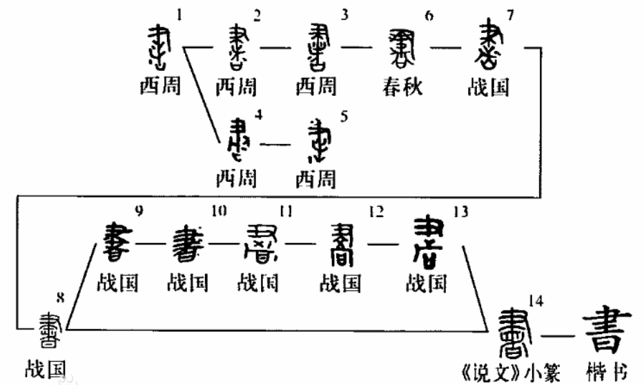 金文的“书”字承接金文,只是在“持笔之手”和“口”之间增添了一些点画,演变为“从聿从者”的会意字。“者”的本义源自以“漆”涂刷器皿,这里用其“涂刷”之义,表示用笔墨记录语言。小篆的“书”字与金文构形相同,形体更为美观匀整,楷书缘此写作“書”,现今简化为“书”。