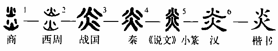 “炎”,会意字。如图所示,甲、金、篆、楷、隶的“炎”字,字形都是上下两堆火两火叠加,从火焰“高冲”的角度,表示大火燃烧时的烈焰冲天。所以,“炎”与“焰”是语音同源字。