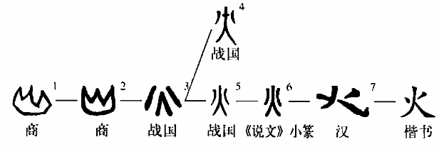 “火”,这是一个十分典型的象形字。“火”,甲骨文字形与“山”相似,像地面上的三(多)股腾腾热焰。造字本义:物体燃烧时产生的光焰。有的甲骨文简化了两侧的焰苗,并将主焰写成“人”形,字形与篆文的“山”相似。金文在甲骨文的基础上省去地面,将甲骨文连在一起的三股焰苗分离,将主焰两边的焰苗简化成撇和捺,至此,“火”的字形与“山”的字形才明显区别开来。篆文承续金文字形。在上下结构的汉字中作偏旁时,“火”被写成“灬”hūo。经由金文的演化,小篆字形保留了火焰的抽象笔意。如果没有甲骨文在先,就很难把今日的“火”字,看做是一个象形字。