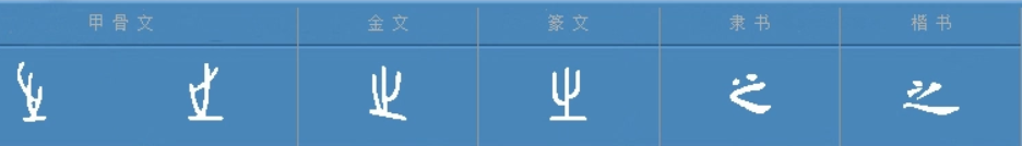 “之”,会意字。甲骨文的“之”字,上面是一个表示“脚趾”的“止”形白描,下面的一横画,则表示出发的地方。两形会意,表示从这里出发,离此前往的意思。金文和小篆的“之”字一脉相承,只是字形在演化过程中,渐失象形的韵味,楷书经由隶变后写作“之”。