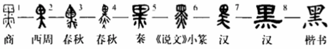 “黑”,甲骨文像一个人的脸,表示脸上有烟灰之类的污点。金文在甲骨文字形基础上再加两点指,强调了“黑”的“污点”特征。有的金文在脸上、身上都加上“污点”,表示浑身上下都沾有污点。古人烧火烹煮时头部经常靠近火堆吹火,因此脸上、身上容易沾上烟灰。有的金文将金文有污点的脸改写。造字本义:沾在脸上、身上的烟灰。篆文将金文沾满污点的花脸写成“田”;并误将金文字形中由人和污点组成的写成“炎”,导致表示人形的“大”消失。隶书则误将篆文字形的上半部写成“里”,将篆文的“火”写成“灬”,至此“黑”字面目全非。