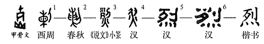 “烈”,会意字。甲骨文的“烈”字,上部是一个“歹”,“歹”是一种古代的剔肉酷刑,“烈”的下部是一个“火”的象形。两形会意,在经过剔肉酷刑的人的脚(身)上再施以火刑。小篆的“烈”字承接甲骨文,只是在“歹”的右侧增添了一个“刀”形,强调用利器剔肉。经由隶变后,楷书写作“烈”。