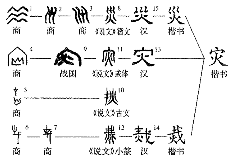 图4的甲骨文是个会意字,模拟“火”在屋(“宀”)里,房子被烧,显然便是“灾”了。图9是战国简帛文字,“火”已开始变形,以后更逐渐变为线条化及笔画化。而小篆(图11)、汉隶(图13)、楷书都是沿着这“火烧房子”的定型发展下来,一直发展到今天,这个“灾”字,望文可以知义。