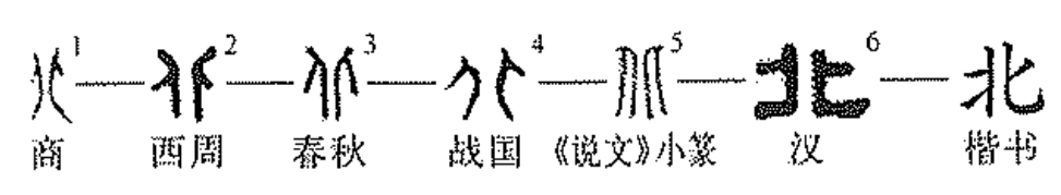 “北”,会意字。甲骨文的“北”,像两人相背。以后的籀文、金文、小篆、隶书和楷书,都是根据这二人相背的形象演变而来的。金文大同;篆文整齐化;隶变后楷书写作“北”。
