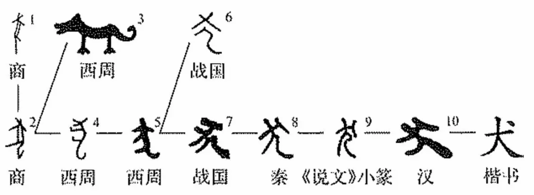 “犬”,象形字。犬字的甲骨文(图1、图2)像头朝上、前后腿朝左或朝右、尾朝下的狗形,竖立是为了书写的方便。金文中有的字形,如图3、图5则更像站立或蹲踞的狗形,尾巴向上卷起,蹲踞的狗头上还有耳形。到小篆变作图9,其实同金文的写法差不多,腿、耳、尾依稀可辨。古文字之后,“犬”的字形逐渐线条化,到楷书时,将代表犬耳的部分变成点,与犬身脱离,整个字形变为大字上加一个点,不很像狗的样子了。在古文字中,“犬”与“豕”字形相近,其主要区别在于尾巴:上卷的、长的是“犬”,下垂的、短的是“豕”shǐ。