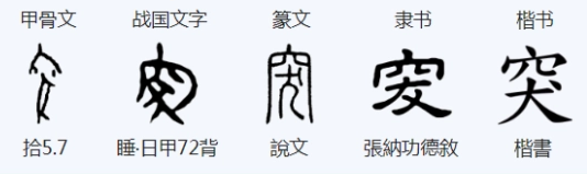 “突”,会意字。甲骨文的“突”字,上半部为“洞穴”之形,下半部是一只犬从洞穴中卒然冲出的情形。如图所示,这幅图画甚至将狗从窝中带出的杂草也描幕出来,可谓形神兼备。“突”上之穴略作增添,使之明晰后,由金文、小篆、楷体一路演进,形体一致,可谓一脉相承。