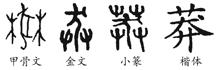 “莽”mǎng,会意字。甲骨文的“莽”字,恰似一只狗(犬)在树林灌木丛中搜索的情形。金文将两边之木(林)改为双草(屮)cǎo之形;小篆将“林”字割裂,成为上下四个小草的形状;楷书又将上下的小草分别整合,写作“莽”。变来变去,但都表示猎犬在灌木丛林或草丛中追逐、驱赶猎物的意思。