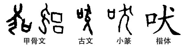 “吠”fèi,会意字。甲骨文的“吠”字左边是一个犬的象形,右边在犬的背部有一个口。两形会意,表示狗的狂叫;甲骨文中的后一款,因狗嘴大张而使狗变形,但旁边的两个“口”,却将狗吠叫时的“汪、汪”之声,表现的十分妥贴。古文和小篆的“吠”字一脉相承,只是更简洁明快些,楷书缘此写作“吠”。