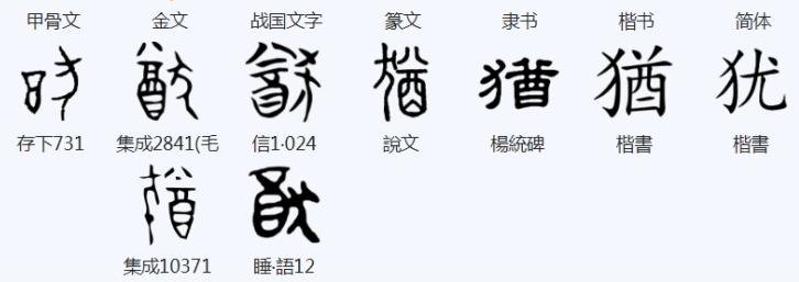 “犹”yóu,会意字,“猶”的简体字。在甲骨文中“猶”字的构形源自狗喝醉酒后的滑稽丑态,这就是古文字中的“犹”字,不论甲骨文、金文或小篆,在“犬”旁总有一个酒(酉)坛的原因。上古时代的酒,类同今日的米酒或醪糟,连喝带吃(酒糟),甜而微酸,酒精度很低,但喝多了一样会醉。狩猎大获后,人们狂饮之余,也会让狗加入会餐之列。这样,在人们的眼前便出现了醉狗之态“犹”,正是对这一情形的真实描述。