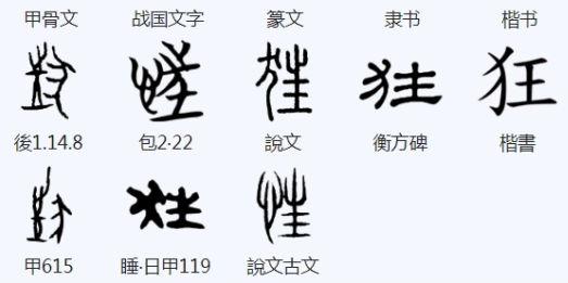 “狂”,会意字。甲骨文(往,为目标吸引而奔行)(犬,狗),表示狗疾奔。造字本义:狗朝目标物疾速奔行。金文调整左右顺序。篆文承续金文字形。隶书将篆文字形中的简化为。楷书则将隶书字形中的简化为“王”。人跑为“走”,马跑为“驰”,狗跑为“狂”;人群齐跑为“奔”,马群齐跑为“骤”,狗群齐跑为“飙”。