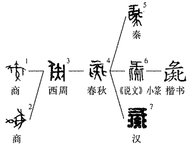 猪还有一个别名,叫做彘(zhì),即野猪。如图所示,甲骨文的文字轮廓乃是一头猪的形象,中间部分的“↑”代表箭矢。两形会意,表示一只猪被箭射中的情形。当然,被箭射中的猪必是狩猎捕获的野猪了。金文的“彘”字发生形变,将一头野猪分割为两半,箭矢从中而过。小篆中的箭矢(↑)已经形变为“矢”字,下半部则分离为两个“比”,用来表示屁股的两半,就像一支箭射中一头野猪屁股正中间的样子。楷书缘此写作“彘”。