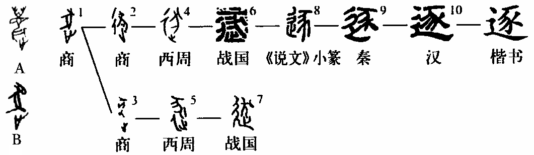 “逐”zhú,会意字。甲骨文的“逐”字为上下结构,上半部是一只猪的图形,下半部是表示一只人脚的“止”(趾)字。“逐”字用“豕”和“止”会意,形象地表示人追猪的情形。如图所示,金文到小篆字形逐步繁化,增添了一个表示道路的形符号。由小篆、隶书一脉相承,除了做为部首的走车(辶chuò)一路演化外,楷书字体简洁明晰,写作“逐”。