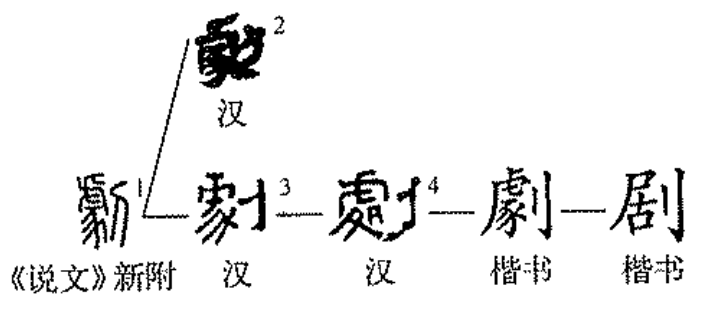 从文字演变过程来看,“豦”是“勮”的初字,“劇”则是“勮”的异体字。所以,现代汉字简化方案将劇、勮二字统一简化为“剧”,即表示用力过分、猛烈之义,如“剧烈、剧变”等;也用来表示戏嬉之义,如“戏剧、演剧”等词语中的“剧”。