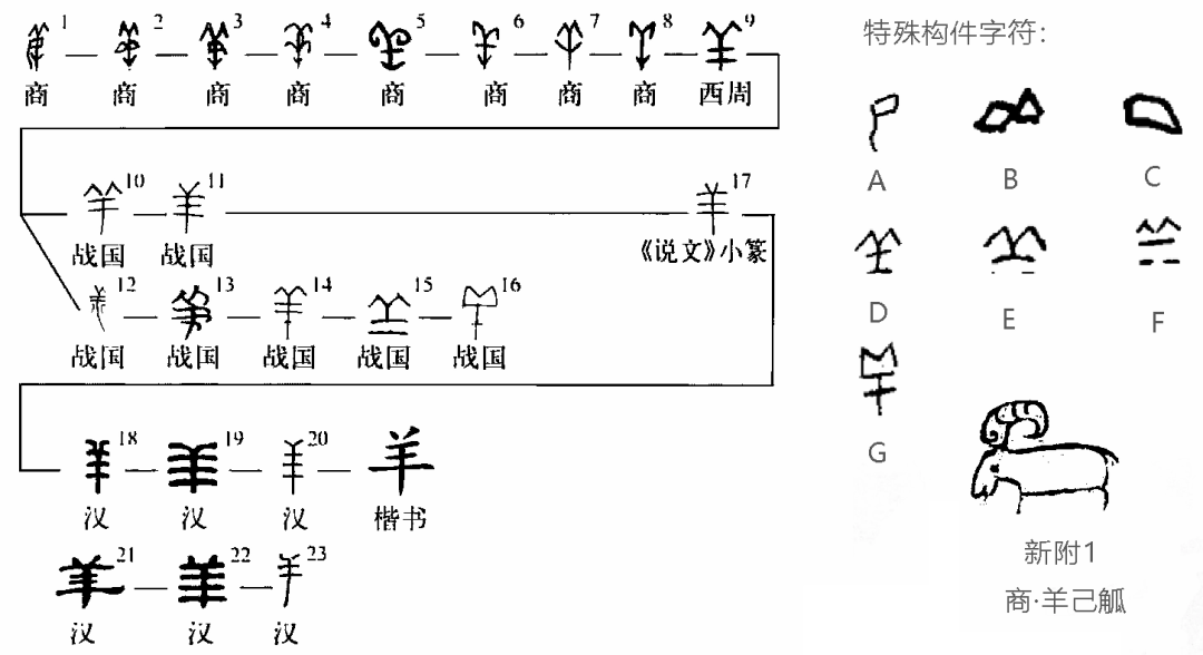 “羊”,象形字。“羊”的造字方法与“牛”字相同,都是以局部替代整体。商代甲骨文(图1-8)的“羊”所描绘的是一只羊头的正视图,上端是两只弯曲的羊角,中间一竖是羊脸的线条化,下部向上斜的两短画像羊的胡须。商代甲骨文或重叠羊角,或在羊角上加诸如图A、B、C的饰物。后来这些装饰笔画统一作一短横。商代金文偶尔也有全身入画的,如商代“羊己觚”上的“羊”(新附1,见《殷周金文集成》)。西周金文(图9)方正规整,已接近小篆:羊角弯度小了,羊下巴和胡子变成“十”字。战国时主流写法与西周一致(图10、11),所出各种异体或加饰件、饰笔、饰点繁化,或省、变作图D、E、F、G等追求诡异、个性的效果,此时古隶有的字已与后代楷书几无区别。《说文解字》将结构整理作“从𦫳,象头脚足尾之形”,属于理据重构,内中不免失误之处。汉代隶书(图18-22)把羊角变成“前”字头(“䒑”cǎo),下巴变成一长横了。于是,楷书(图F)也相沿讹变,最终把羊胡子和鼻梁变为“羊”中的一竖,成为记号字。