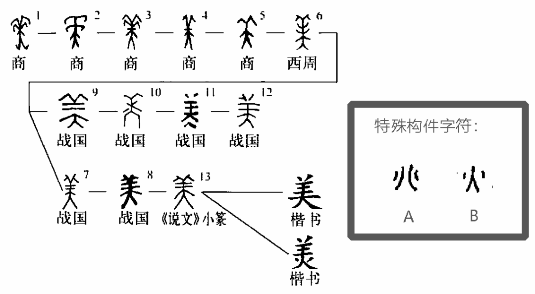 在造字时代,羊常用于祭祀,因而“羊”具有“祥”的含义。美,甲骨文=(羊,祥)+(大,人),表示人的神情安祥。造字本义:古代修养深厚的高人所表现的安祥、和平。在造字时代的古人眼里,安祥、宁静的人最“美”。篆文大体承续金文字形。隶书误将篆文的“大”写成“火”。