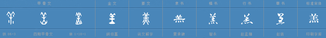 “羔”,指事字。在羊的身上加四点指事符号,像一只羊的身上火星四溅,表示用小羊做的烤全羊。有的甲骨文写成上下结构的会义字:(羊)+(火,烘烤),明确了用火“烤羊”的含义。有的甲骨文像是羊在上下两堆火之间,表示将全羊放在窑中立体烘烤。造字本义:用小羊做的烤全羊。隶书将篆文字形中的“火”简写成“四点底”。