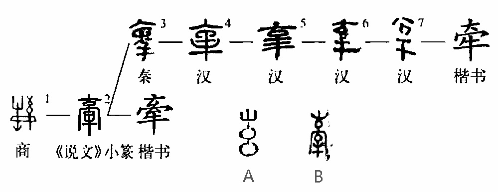 “牵”,指事字,“牽”的简体字。甲骨文=(牛)+(圈圈)+(系,绳),像是在牛鼻子上系着一要绳子。造字本义:将绳子系在牛鼻子上拉牛。金文用牛鼻栓代替甲骨文字形中的圈圈。