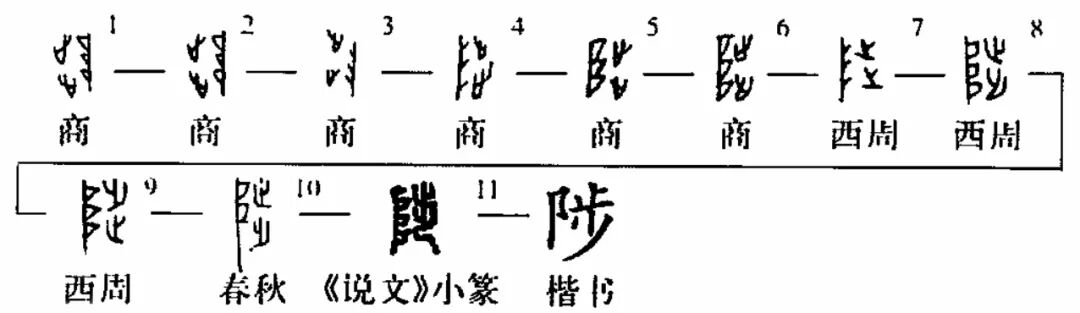 “陟”,这也是一个会意字。甲骨文的”陟字与“降”字取意相同,只是在构形上为两足向上移动之形,表示上升、登高之义。显而易见,不仅在构形上,而且在词义上,“陟”与“降”都是对反义词。