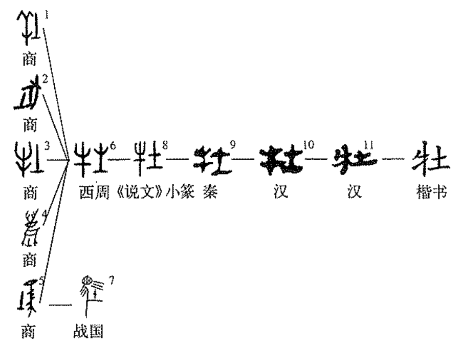 甲骨文的“牡”字,左旁是“牛”之象形,右旁是雄性动物生殖器的图形“⊥”(士)。实际上,“牡”的发音同“牟”相似,源自公牛发情求偶时的鸣叫声。从一定意义上讲,“牡”字右半边由“士”向“土”的演变,是一种讹变但其中仍有后期形声字改造会意字的法则在内。