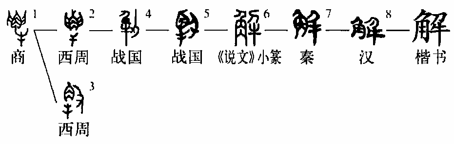 “解”,甲骨文=(双手)+(角)+(牛),像屠夫双手从牛的头上剖取牛角,牛角上的两点,表示血滴。取牛角,是剖牛过程中技术最复杂、最具代表性的步骤,因此用取牛角代表剖牛。造字本义:剖牛,取牛角。金文承续甲骨文字形。篆文省去金文的两手,另加“刀”,结构有所调整。隶书将篆文的“牛”写成,牛角形象尽失。