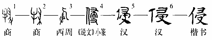 金文的“侵”字发生类符置换,形被个背对的人所替代。整体图形,如同手持笤帚从背后驱赶他人。小篆承接金文,只是部首位置左右调整,楷书缘此写作“侵”。