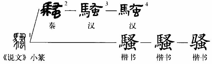 “骚”sāo,会意兼形声字,“騒”的简体字。从马、蚤声。“骚”字的原意有二:一是指马身上有马蝇类的虫子,导致马的骚动不安。又由马的骚动不安,引申为事态的扰乱或不安定,如“骚动、骚乱、骚扰”等。古文和小篆的“骚”字,右半部的上边是一只“手”(又)或一个“叉”,下边是一个“虫”,以手(马尾)搔虫正是这一意义的注解;其二,指马因发情而引发的骚动。北方方言中,人们将性情勃发的雄性动物,称作“骚马”、“骚驴”。后来又转指人的举止轻佻、作风下流,如“骚货、风骚”以及陕西关中方言中的“骚情”等。显然肢体和内心骚动之义当由第一义引申而来。