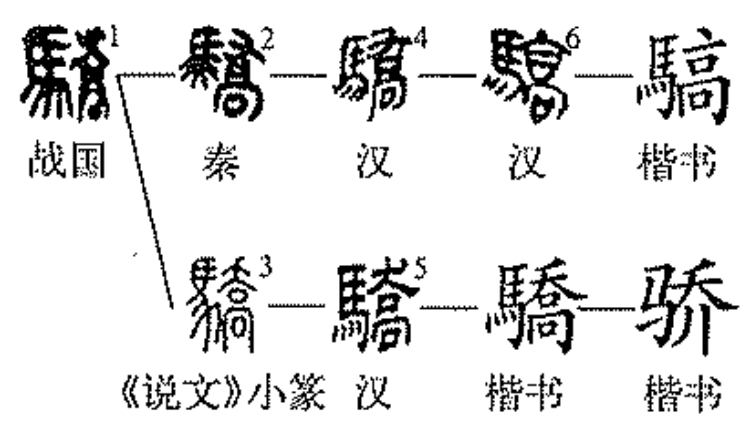 “骄”jiāo,会意字,“驕”的简体字。乔,表示高。金文=(马)+(喬=乔,高),造字本义:马匹高大。篆文承续金文字形。隶书将篆文“马”的四足写成“四点底”。