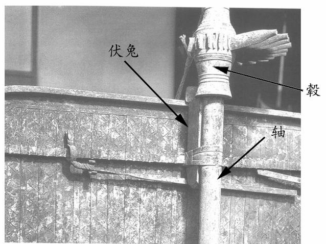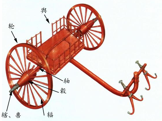 伏兔:由于轴和辕是十字交叉连接在一起,辕的一端置于轴的正中心,辕本身的厚度会使得轸和舆放在上面时很难固定,容易晃动。古人为了让车厢部分平稳地放置,于是在轴的两侧放置两块伏兔(厚度与轴直径相当),垫出一个水平面。