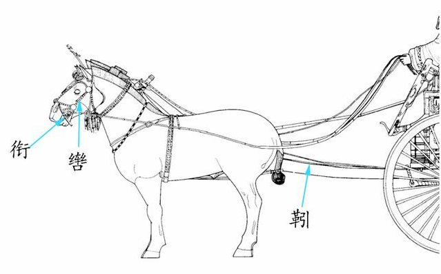 衔(xián):由于马的口腔内部有一块中空区域,将衔放在马嘴中勒住,如果有转向需求,驭者只需扯动马衔,疼痛将使马快速反应。